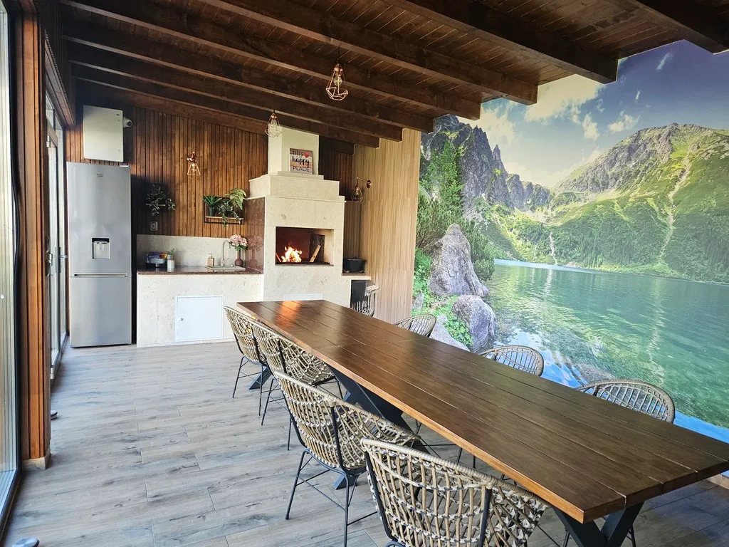 Sală de mese cu design modern, grătar și ceaun interior